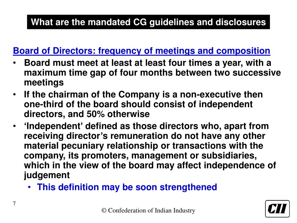 What are the mandated CG guidelines and disclosures Board of Directors: frequency of meetings and composition • Board must meet at least at least four times a year, with a maximum time gap of four months between two successive meetings • If the chairman of the Company is a non-executive then one-third of the board should consist of independent directors, and 50% otherwise • ‘Independent’ defined as those directors who, apart from receiving director’s remuneration do not have any other material pecuniary relationship or transactions with the company, its promoters, management or subsidiaries, which in the view of the board may affect independence of judgement • This definition may be soon strengthened