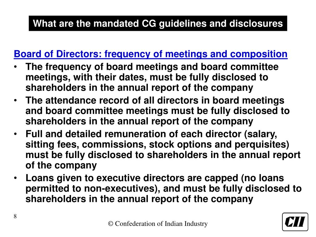 What are the mandated CG guidelines and disclosures Board of Directors: frequency of meetings and composition • The frequency of board meetings and board committee meetings, with their dates, must be fully disclosed to shareholders in the annual report of the company • The attendance record of all directors in board meetings and board committee meetings must be fully disclosed to shareholders in the annual report of the company • Full and detailed remuneration of each director (salary, sitting fees, commissions, stock options and perquisites) must be fully disclosed to shareholders in the annual report of the company • Loans given to executive directors are capped (no loans permitted to non-executives), and must be fully disclosed to shareholders in the annual report of the company