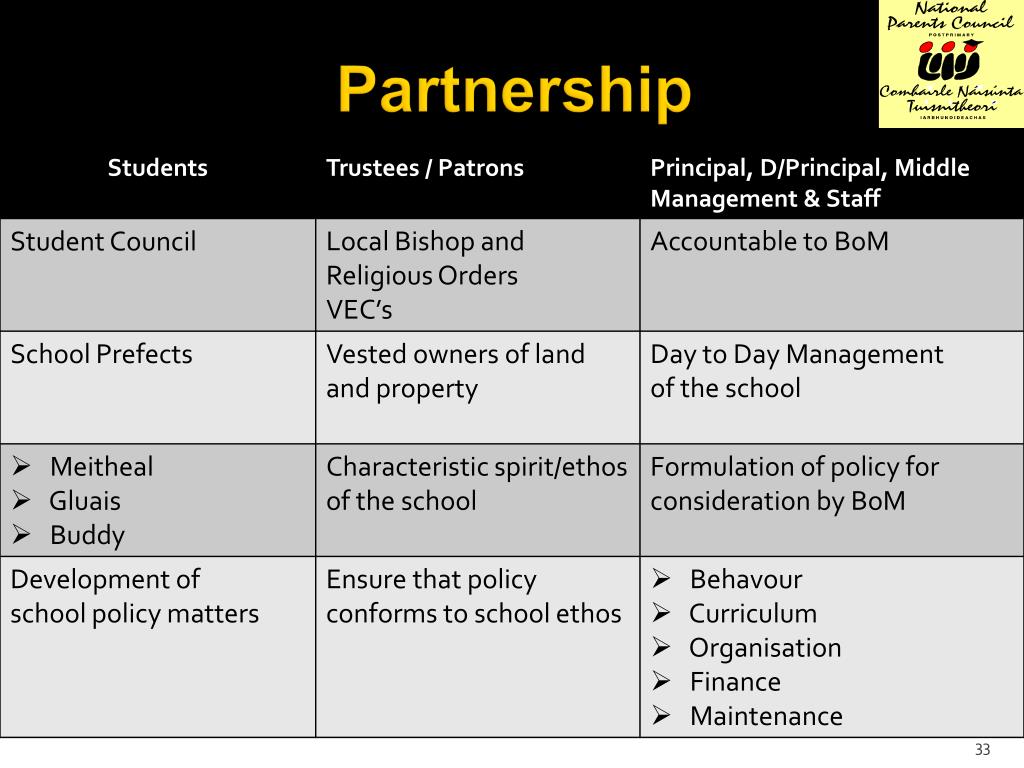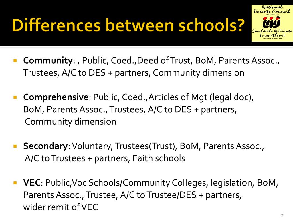 Differences between schools? • Community: , Public, Coed.,Deed of Trust, BoM, Parents Assoc., Trustees, A/C to DES + partners, Community dimension • Comprehensive: Public, Coed.,Articles of Mgt (legal doc), BoM, Parents Assoc., Trustees, A/C to DES + partners, Community dimension • Secondary: Voluntary, Trustees(Trust), BoM, Parents Assoc., A/C to Trustees + partners, Faith schools • VEC: Public,Voc Schools/Community Colleges, legislation, BoM, Parents Assoc., Trustee, A/C to Trustee/DES + partners, wider remit of VEC