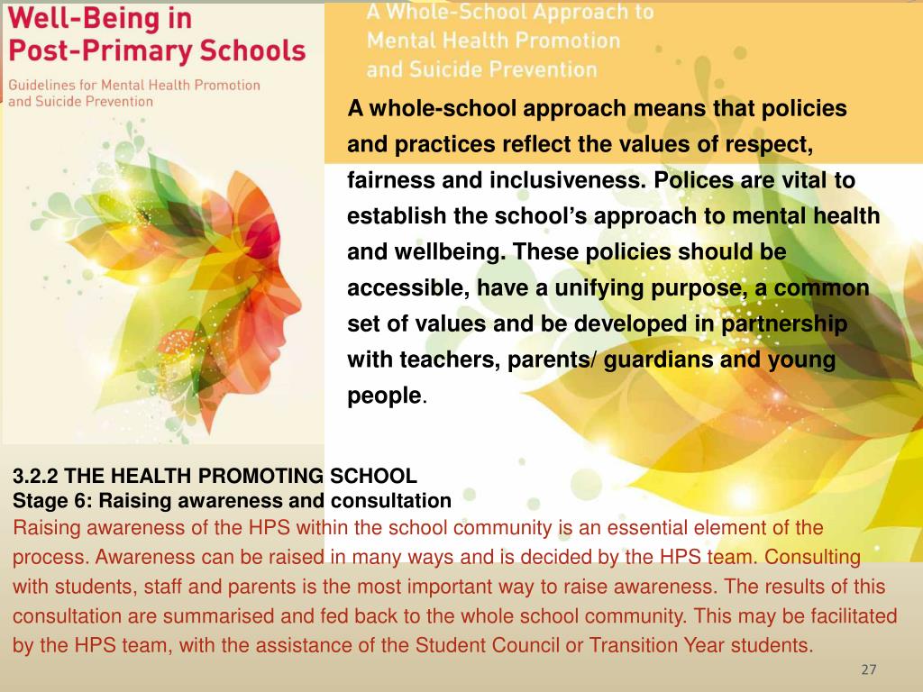 A whole-school approach means that policies and practices reflect the values of respect, fairness and inclusiveness. Polices are vital to establish the school’s approach to mental health and wellbeing. These policies should be accessible, have a unifying purpose, a common set of values and be developed in partnership with teachers, parents/ guardians and young people. 3.2.2 THE HEALTH PROMOTING SCHOOLStage 6: Raising awareness and consultation Raising awareness of the HPS within the school community is an essential element of the process. Awareness can be raised in many ways and is decided by the HPS team. Consulting with students, staff and parents is the most important way to raise awareness. The results of this consultation are summarised and fed back to the whole school community. This may be facilitated by the HPS team, with the assistance of the Student Council or Transition Year students.