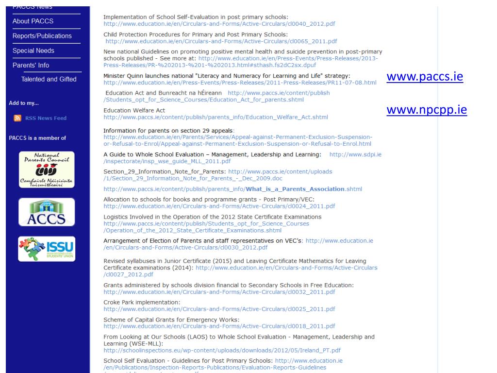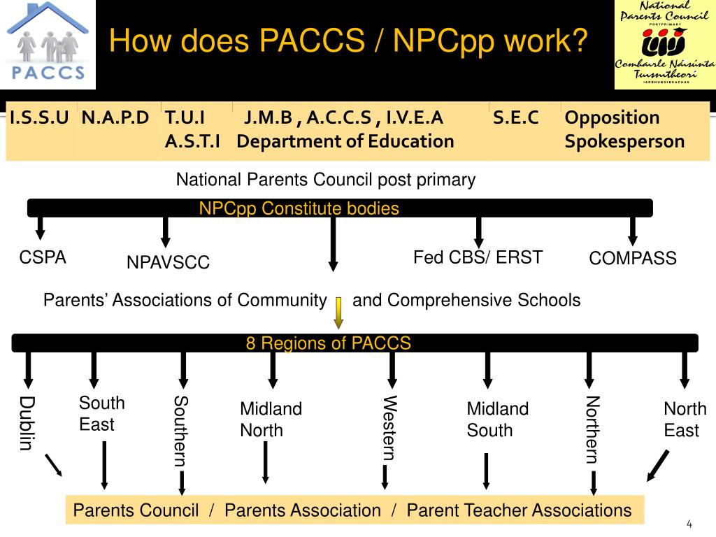 How does PACCS / NPCpp work? National Parents Council post primary NPCpp Constitute bodies CSPA Fed CBS/ ERST COMPASS NPAVSCC Parents’ Associations of Community and Comprehensive Schools 8 Regions of PACCS South East Midland North Midland South North East Western Northern Southern Dublin Parents Council / Parents Association / Parent Teacher Associations