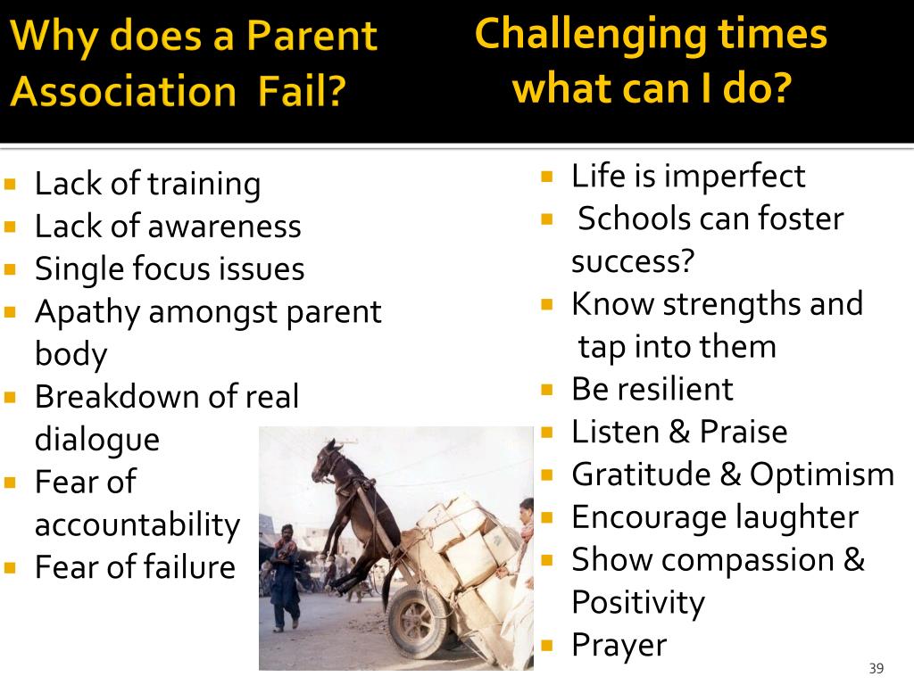 Challenging times...what can I do? Why does a Parent Association Fail? • Life is imperfect • Schools can foster success? • Know strengths and tap into them • Be resilient • Listen & Praise • Gratitude & Optimism • Encourage laughter • Show compassion & Positivity • Prayer • Lack of training • Lack of awareness • Single focus issues • Apathy amongst parent body • Breakdown of real dialogue • Fear of accountability • Fear of failure