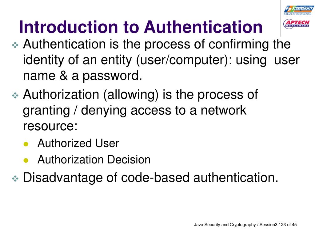 Introduction to Authentication • Authentication is the process of confirming the identity of an entity (user/computer): using user name & a password. • Authorization (allowing) is the process of granting / denying access to a network resource: • Authorized User • Authorization Decision • Disadvantage of code-based authentication. Java Security and Cryptography / Session3 / 23 of 45