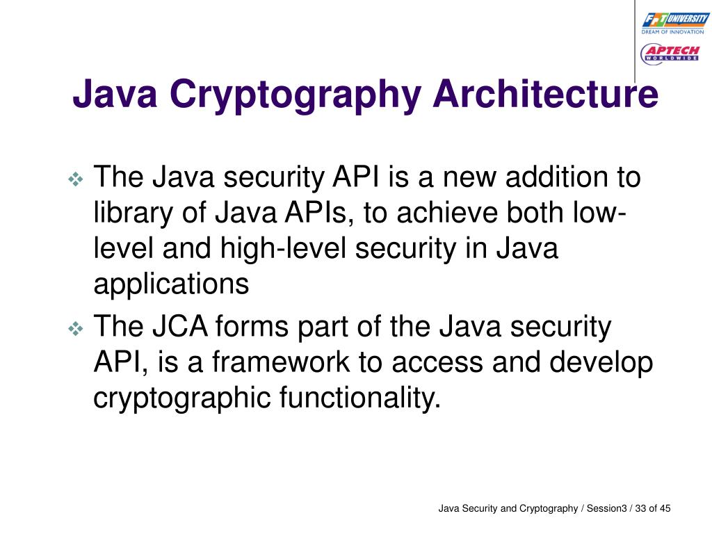 Java Cryptography Architecture • The Java security API is a new addition to library of Java APIs, to achieve both low-level and high-level security in Java applications • The JCA forms part of the Java security API, is a framework to access and develop cryptographic functionality. Java Security and Cryptography / Session3 / 33 of 45