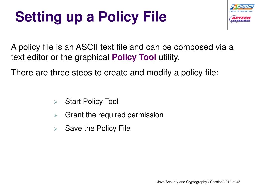 Setting up a Policy File A policy file is an ASCII text file and can be composed via a text editor or the graphical Policy Tool utility. There are three steps to create and modify a policy file: • Start Policy Tool • Grant the required permission • Save the Policy File Java Security and Cryptography / Session3 / 12 of 45