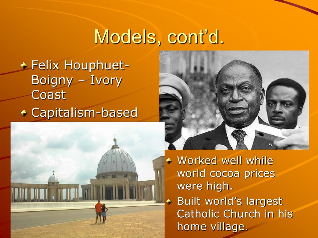 Models, cont’d. • Felix Houphuet-Boigny – Ivory Coast • Capitalism-based on exports • Wo • Worked well while world cocoa prices were high. • Built world’s largest Catholic Church in his home village.