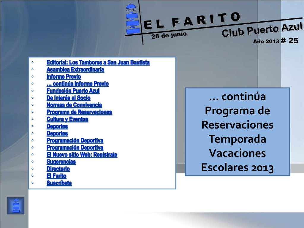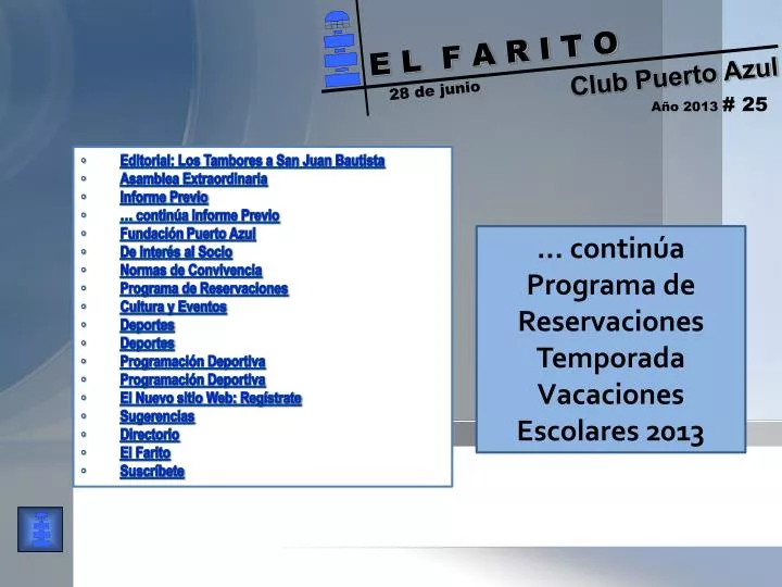 E L F A R I T O Club Puerto Azul 28 de junio Año 2013 # 25 • Editorial: Los Tambores a San Juan Bautista • Asamblea Extraordinaria • Informe Previo • … continúa Informe Previo • Fundación Puerto Azul • De Interés al Socio • Normas de Convivencia • Programa de Reservaciones • Cultura y Eventos • Deportes • Deportes • Programación Deportiva • Programación Deportiva • El Nuevo sitio Web: Regístrate • Sugerencias • Directorio • El Farito • Suscríbete • … continúa • Programa de Reservaciones • Temporada Vacaciones Escolares 2013