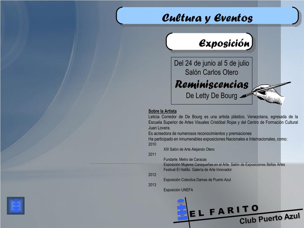 Cultura y Eventos Exposición Del 24 de junio al 5 de julio Salón Carlos Otero Reminiscencias De Letty De Bourg Sobre la Artista Leticia Corredor de DeBourg es una artista plástico, Venezolana, egresada de la Escuela Superior de Artes Visuales Cristóbal Rojas y del Centro de Formación Cultural Juan Lovera. Es acreedora de numerosos reconocimientos y premiaciones Ha participado en innumerables exposiciones Nacionales e Internacionales, como: 2010 XIII Salón de Arte Alejando Otero 2011 Fundarte. Metro de Caracas Exposición Mujeres Caraqueñas en el Arte. Salón de Exposiciones Bellas Artes Festival El Hatillo. Galería de Arte Innovador 2012 Exposición Colectiva Damas de Puerto Azul 2013 Exposición UNEFA