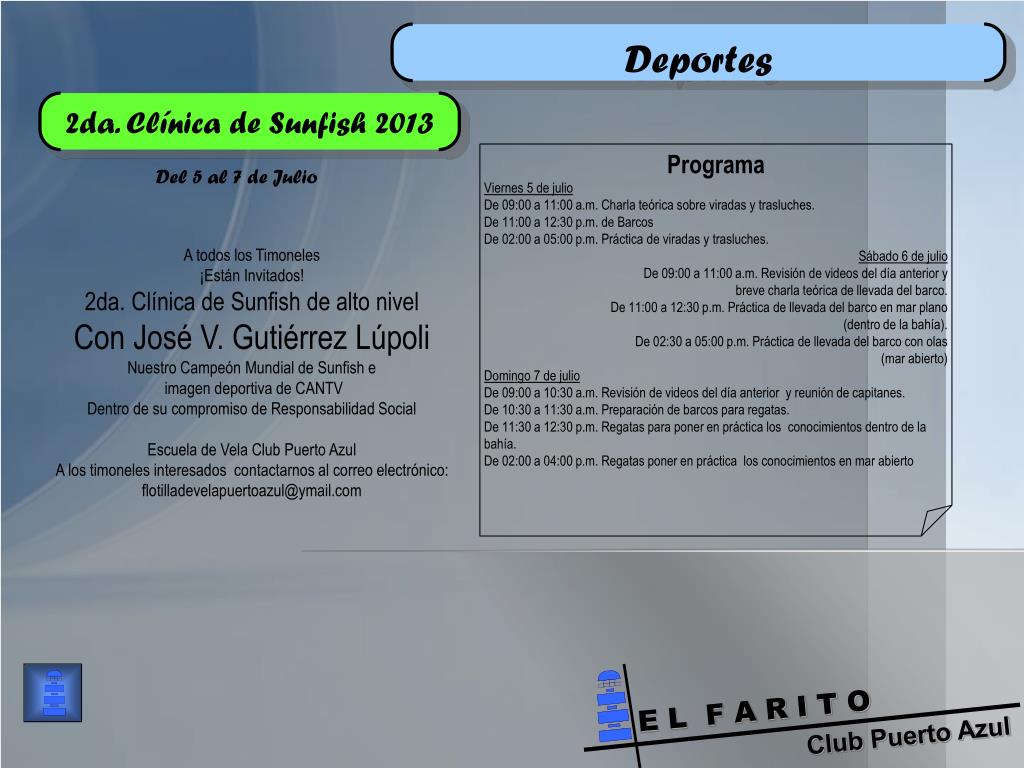 Deportes 2da. Clínica de Sunfish 2013 Programa Viernes 5 de julio De 09:00 a 11:00 a.m. Charla teórica sobre viradas y trasluches. De 11:00 a 12:30 p.m. de Barcos De 02:00 a 05:00 p.m. Práctica de viradas y trasluches. Sábado 6 de julio De 09:00 a 11:00 a.m. Revisión de videos del día anterior y breve charla teórica de llevada del barco. De 11:00 a 12:30 p.m. Práctica de llevada del barco en mar plano (dentro de la bahía). De 02:30 a 05:00 p.m. Práctica de llevada del barco con olas (mar abierto) Domingo 7 de julio De 09:00 a 10:30 a.m. Revisión de videos del día anterior y reunión de capitanes. De 10:30 a 11:30 a.m. Preparaciónde barcos para regatas. De 11:30 a 12:30 p.m. Regatas para poner en práctica los conocimientos dentro de la bahía. De 02:00 a 04:00 p.m. Regatas poner en práctica los conocimientos en mar abierto Del 5 al 7 de Julio A todos los Timoneles ¡Están Invitados! 2da. Clínica de Sunfish de alto nivel Con José V. Gutiérrez Lúpoli Nuestro Campeón Mundial de Sunfish e imagen deportiva de CANTV Dentro de su compromiso de Responsabilidad Social Escuela de Vela Club Puerto Azul A los timoneles interesados contactarnos al correo electrónico: flotilladevelapuertoazul@ymail.com