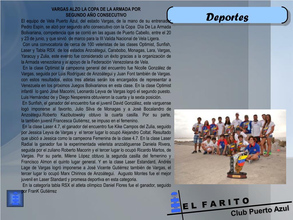 VARGAS ALZO LA COPA DE LA ARMADA POR SEGUNDO AÑO CONSECUTIVO El equipo de Vela Puerto Azul, del estado Vargas, de la mano de su entrenador Pedro Espín, se alzó por segundo año consecutivo con la Copa Día De La Armada Bolivariana, competencia que se corrió en las aguas de Puerto Cabello, entre el 20 y 23 de junio, y que sirvió de marco para la III Valida Nacional de Vela Ligera. Con una convocatoria de cerca de 100 veleristas de las clases Optimist, Sunfish, Laser y Tabla RSX de los estados Anzoátegui, Carabobo, Monagas, Lara, Vargas, Yaracuy y Zulia, este evento fue considerado un éxito gracias a la organización de la Armada venezolana y al apoyo de la Federación Venezolana de Vela. En la clase Optimist la campeona general del encuentro fue Nicolle González de Vargas, seguida por Luis Rodríguez de Anzoátegui y Juan Font también de Vargas. con estos resultados, estos tres atletas serán los encargados de representar a Venezuela en los próximos Juegos Bolivarianos en esta clase. En la clase Optimist infantil lo ganó José Macorini, Leonardo Leyva de Vargas logró el segundo puesto. Luis Hernández de y Diego Nespereira obtuvieron la cuarta y la sexta posición. En Sunfish, el ganador del encuentro fue el juvenil David González, este varguense logó imponerse al favorito, Julio Silva de Monagas y a José Bocalandro de Anzoátegui.RobertoKazibutowsky obtuvo la cuarta casilla. Por su parte, la también juvenil Francesca Gutiérrez, se impuso en el femenino. En la clase Laser 4.7, el ganador del encuentro fue Kike Campos del Zulia, seguido por Jessica Leyva de Vargas y el tercer lugar lo ocupó Alejandro Coltat. Resultado que ubicó a Jessica como la campeona Femenina de la clase 4.7. En la clase Laser Radial la ganador fue la experimentada veleristaanzoátiguense Daniela Rivera, seguida por el zuliano Roberto Macorin y el tercer lugar lo ocupó Ricardo Martos, de Vargas. Por su parte, Milene López obtuvo la segunda casilla del femenino y Francisco Almon el quinto lugar general. Y en la clase Laser Estandard, Andrés Lage de Vargas logró imponerse a José Vicente Gutiérrez también de Vargas, el tercer lugar lo ocupó Marx Chirinos de Anzoátegui. Augusto Montes fue el mejor juvenil en Laser Standard y promesa deportiva en esta categoria. En la categoría tabla RSX el atleta olímpico Daniel Flores fue el ganador, seguido por FranK Gutiérrez Deportes