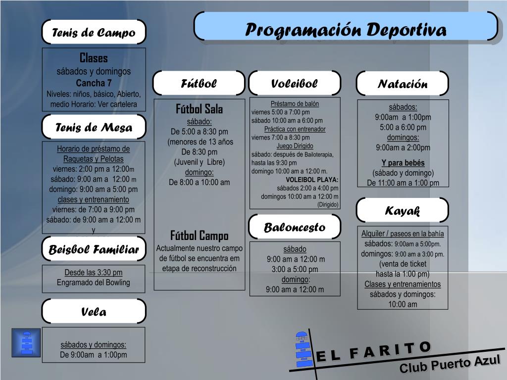 Programación Deportiva Tenis de Campo Clases sábados y domingos Cancha 7 Niveles: niños, básico, Abierto, medio Horario: Ver cartelera Fútbol Voleibol Natación Préstamo de balón viernes 5:00 a 7:00 pm sábado 10:00 am a 6:00 pm Práctica con entrenador viernes 7:00 a 8:30 pm Juego Dirigido sábado: después de Bailoterapia, hasta las 9:30 pm domingo 10:00 am a 12:00 m. VOLEIBOL PLAYA: sábados 2:00 a 4:00 pm domingos 10:00 am a 12:00 m (Dirigido) Fútbol Sala sábado: De 5:00 a 8:30 pm (menores de 13 años De 8:30 pm (Juvenil y Libre) domingo: De 8:00 a 10:00 am Fútbol Campo Actualmentenuestro campo de fútbol se encuentra em etapa de reconstrucción sábados: 9:00am a 1:00pm 5:00 a 6:00 pm domingos: 9:00am a 2:00pm Y para bebés (sábado y domingo) De 11:00 am a 1:00 pm Tenis de Mesa Horario de préstamo de Raquetas y Pelotas viernes: 2:00 pm a 12:00m sábado: 9:00 am a 12:00 m domingo: 9:00 am a 5:00 pm clases y entrenamiento viernes: de 7:00 a 9:00 pm sábado: de 9:00 am a 12:00 m y de 3:00 a 6:00 pm Kayak Baloncesto Alquiler / paseos en la bahía sábados: 9:00am a 5:00pm. domingos: 9:00 am a 3:00 pm. (venta de ticket hasta la 1:00 pm) Clases y entrenamientos sábados y domingos: 10:00 am Beisbol Familiar sábado 9:00 am a 12:00 m 3:00 a 5:00 pm domingo: 9:00 am a 12:00 m Desde las 3:30 pm Engramado del Bowling Vela sábados y domingos: De 9:00am a 1:00pm