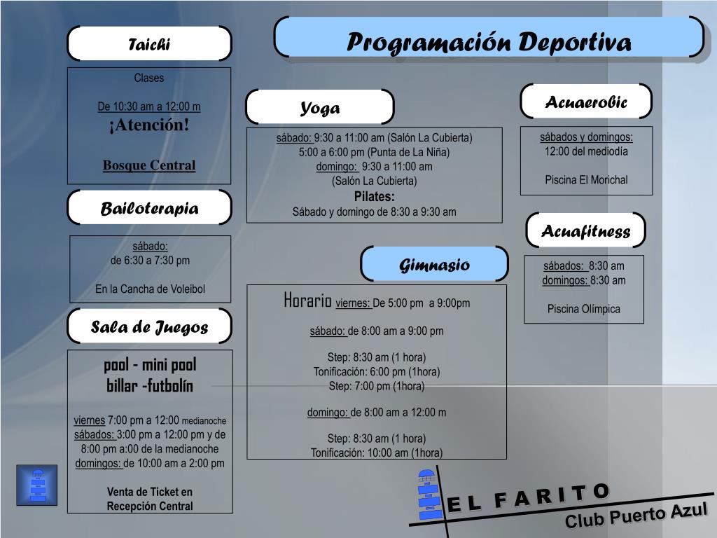 Programación Deportiva Taichi Clases De 10:30 am a 12:00 m ¡Atención! Bosque Central Acuaerobic Yoga sábados y domingos: 12:00 del mediodía Piscina El Morichal sábado: 9:30 a 11:00 am (Salón La Cubierta) 5:00 a 6:00 pm (Punta de La Niña) domingo: 9:30 a 11:00 am (Salón La Cubierta) Pilates: Sábado y domingo de 8:30 a 9:30 am Bailoterapia Acuafitness sábado: de 6:30 a 7:30 pm En la Cancha de Voleibol Gimnasio sábados: 8:30 am domingos: 8:30 am Piscina Olímpica Horario viernes: De 5:00 pm a 9:00pm sábado: de 8:00 am a 9:00 pm Step: 8:30 am (1 hora) Tonificación: 6:00 pm (1hora) Step: 7:00 pm (1hora) domingo: de 8:00 am a 12:00 m Step: 8:30 am (1 hora) Tonificación: 10:00 am (1hora) Sala de Juegos pool - mini pool billar -futbolín viernes 7:00 pm a 12:00 medianoche sábados: 3:00 pm a 12:00 pm y de 8:00 pm a:00 de la medianoche domingos: de 10:00 am a 2:00 pm Venta de Ticket en Recepción Central