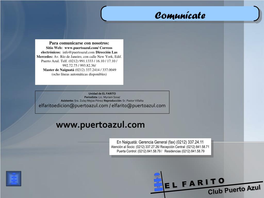 Comunícate Para comunicarse con nosotros: Sitio Web: www.puertoazul.com/ Correos electrónicos: info@puertoazul.com Dirección Las Mercedes: Av. Río de Janeiro, con calle New York, Edif. Puerto Azul. Telf. (0212) 991.1333 / 16.10 / 17.10 / 992.72.75 / 993.82.36/ Master de Naiguatá (0212) 337.2414 / 337.0049 (ocho líneas automáticas disponibles) Unidad de EL FARITO Periodista: Lic. Myriam Sosa/ Asistente: Sra. Zulay Mejias Pérez/ Reproducción: Sr. Pastor Villalta elfaritoedicion@puertoazul.com / elfarito@puertoazul.com www.puertoazul.com En Naiguatá: Gerencia General (fax) (0212) 337.24.11 Atención al Socio: (0212) 337.27.26/ Recepción Central: (0212) 841.58.71 Puerta Control: (0212) 841.58.79 / Residencias (0212) 841.58.79