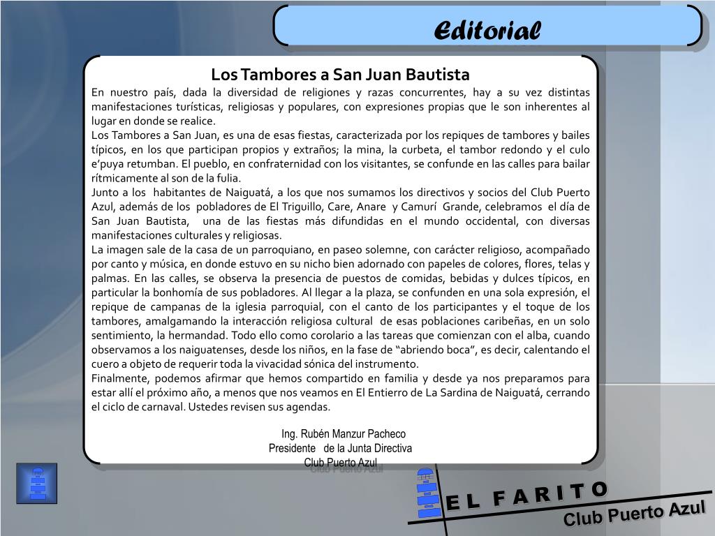 Editorial Los Tambores a San Juan Bautista En nuestro país, dada la diversidad de religiones y razas concurrentes, hay a su vez distintas manifestaciones turísticas, religiosas y populares, con expresiones propias que le son inherentes al lugar en donde se realice. Los Tambores a San Juan, es una de esas fiestas, caracterizada por los repiques de tambores y bailes típicos, en los que participan propios y extraños; la mina, la curbeta, el tambor redondo y el culo e’puya retumban. El pueblo, en confraternidad con los visitantes, se confunde en las calles para bailar rítmicamente al son de la fulia. Junto a los habitantes de Naiguatá, a los que nos sumamos los directivos y socios del Club Puerto Azul, además de los pobladores de El Triguillo, Care, Anare y Camurí Grande, celebramos el día de San Juan Bautista, una de las fiestas más difundidas en el mundo occidental, con diversas manifestaciones culturales y religiosas. La imagen sale de la casa de un parroquiano, en paseo solemne, con carácter religioso, acompañado por canto y música, en donde estuvo en su nicho bien adornado con papeles de colores, flores, telas y palmas. En las calles, se observa la presencia de puestos de comidas, bebidas y dulces típicos, en particular la bonhomía de sus pobladores. Al llegar a la plaza, se confunden en una sola expresión, el repique de campanas de la iglesia parroquial, con el canto de los participantes y el toque de los tambores, amalgamando la interacción religiosa cultural de esas poblaciones caribeñas, en un solo sentimiento, la hermandad. Todo ello como corolario a las tareas que comienzan con el alba, cuando observamos a los naiguatenses, desde los niños, en la fase de “abriendo boca”, es decir, calentando el cuero a objeto de requerir toda la vivacidad sónica del instrumento. Finalmente, podemos afirmar que hemos compartido en familia y desde ya nos preparamos para estar allí el próximo año, a menos que nos veamos en El Entierro de La Sardina de Naiguatá, cerrando el ciclo de carnaval. Ustedes revisen sus agendas. Ing. Rubén Manzur Pacheco Presidente de la Junta Directiva Club Puerto Azul