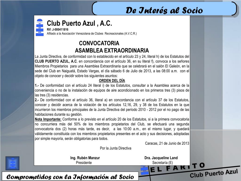 De Interés al Socio • Club Puerto Azul , A.C. • Rif: J-000411816 • Afiliado a la Asociación Venezolana de Clubes Recreacionales (A.V.C.R.) CONVOCATORIA ASAMBLEA EXTRAORDINARIA La Junta Directiva, de conformidad con lo establecido en el artículo 23 y 24, literal h) de los Estatutos del CLUB PUERTO AZUL, A.C. en concordancia con el artículo 36, en su literal f), convoca a los señores Miembros Propietarios para una Asamblea Extraordinaria que se celebrará en el salón El Galeón, en la sede del Club en Naiguatá, Estado Vargas, el día sábado 6 de Julio de 2013, a las 08:00 a.m. con el objeto de conocer y decidir sobre los siguientes asuntos: ORDEN DEL DÍA 1.- De conformidad con el artículo 24 literal i) de los Estatutos, consultar a la Asamblea acerca de la conveniencia o no de la instalación de equipos de aire acondicionado en los primeros tres (3) pisos de las tres (3) residencias. 2.- De conformidad con el artículo 36, literal a) en concordancia con el artículo 37 de los Estatutos, conocer y decidir acerca de la violación de los artículos 12,16, 29, y 38 de los Estatutos en la que incurrieron los miembros principales de la Junta Directiva del período 2010 - 2012 por el no pago de las habitaciones durante su gestión. Nota Importante: Conforme a lo previsto en el artículo 20 de los Estatutos, si a la primera convocatoria no concurriera más del 50% de los miembros propietarios del Club, se efectuará una segunda convocatoria dos (2) horas más tarde, es decir, a las 10:00 a.m., en el mismo lugar, y quedará válidamente constituida con los miembros propietarios presentes en el acto y sus decisiones, adoptadas por simple mayoría, serán obligatorias para todos. Caracas, 21 de Junio de 2013 Por la Junta Directiva Ing. Rubén Manzur Dra. Jacqueline Land Presidente Secretaría (E) Comprometidos con la Información al Socio