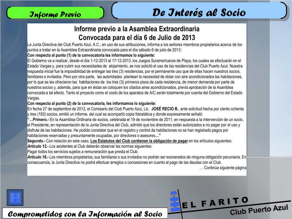De Interés al Socio Informe Previo Informe previo a la Asamblea Extraordinaria Convocada para el día 6 de Julio de 2013 La Junta Directiva del Club Puerto Azul, A.C., en uso de sus atribuciones, informa a los señores miembros propietarios acerca de los puntos a tratar en la Asamblea Extraordinaria convocada para el día sábado 6 de julio de 2013: Con respecto al punto (1) de la convocatoria les informamos lo siguiente: El Gobierno va a realizar, desde el día 1-12-2013 al 17-12-2013, los Juegos Suramericanos de Playa, los cuales se efectuarán en el Estado Vargas y, para cubrir sus necesidades de alojamiento, se nos solicitó el uso de las residencias del Club Puerto Azul. Nuestra respuesta inicial fue la imposibilidad de entregar las tres (3) residencias, por el permanente uso que de ellas hacen nuestros socios, familiares e invitados. Pero por otra parte, las autoridades plantean la necesidad de dotar con aire acondicionados las habitaciones, por lo que se les ofrecieron las habitaciones de los tres (3) primeros pisos de cada residencia, de menor demanda por parte de nuestros socios y, además, para que en éstas se coloquen los citados aires acondicionados, previa aprobación de la Asamblea convocada a tal efecto. Tanto el proyecto como el costo de los aparatos de A/C serán totalmente por cuenta del Gobierno del Estado Vargas. Con respecto al punto (2) de la convocatoria, les informamos lo siguiente: En fecha 27 de septiembre de 2012, el Comisario del Club Puerto Azul, Lic. JOSÉ RECIO B., ante solicitud hecha por ciento ochenta y tres (183) socios, emitió un informe, del cual se acompañó copia fotostática y donde expresamente señaló: “…Primero.- En la Asamblea Ordinaria de socios, celebrada el 19 de noviembre de 2011, en respuesta a la intervención de un socio, el Presidente, en representación de la Junta Directiva del Club, admitió que los directores están autorizados a no pagar por el uso y disfrute de las habitaciones. He podido constatar que en el registro y control de habitaciones no se han registrado pagos por habitaciones reservadas y presuntamente ocupadas, por directores o asesores…” Segundo.- Con relación en este caso, Los Estatutos del Club contienen la obligación de pagar en los artículos siguientes: Artículo 12.- Los asistentes al Club deberán observar las normas siguientes: Pagar todos los servicios sujetos a remuneración que presta el Club. Artículo 16.- Los miembros propietarios, sus familiares o sus invitados no podrán ser exonerados de ninguna obligación pecuniaria. En consecuencia, la Junta Directiva no podrá efectuar arreglos o concesiones en cuanto al pago de las deudas con el Club. … Continúa siguiente página Comprometidos con la Información al Socio