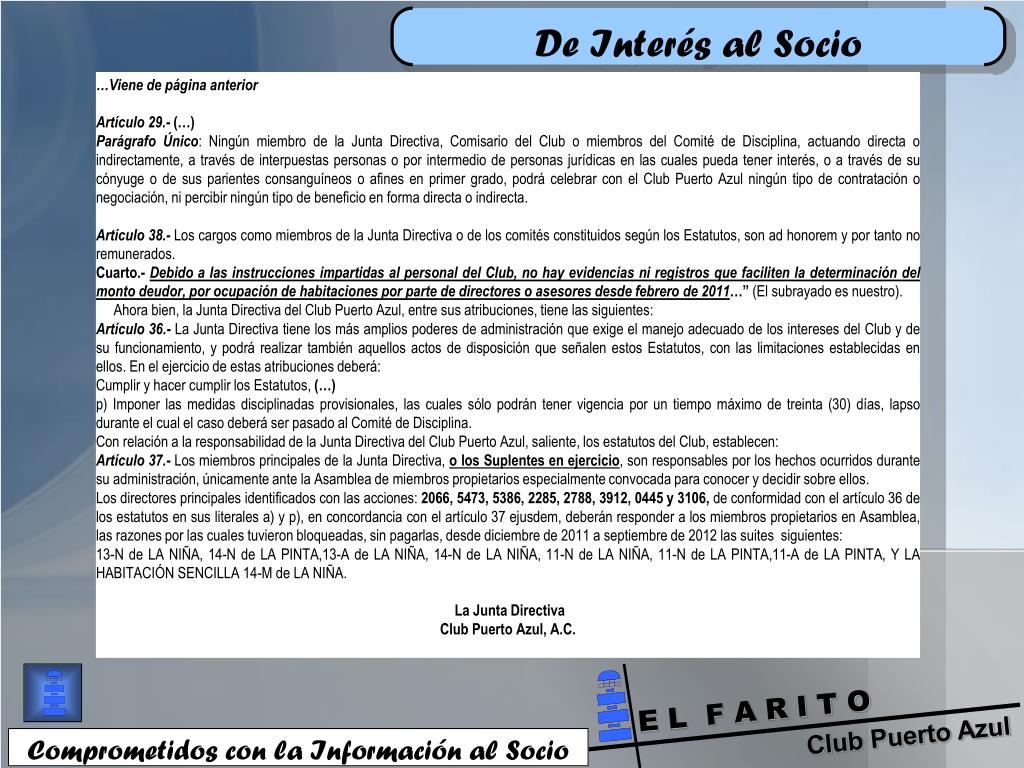 De Interés al Socio …Viene de página anterior Artículo 29.- (…) Parágrafo Único: Ningún miembro de la Junta Directiva, Comisario del Club o miembros del Comité de Disciplina, actuando directa o indirectamente, a través de interpuestas personas o por intermedio de personas jurídicas en las cuales pueda tener interés, o a través de su cónyuge o de sus parientes consanguíneos o afines en primer grado, podrá celebrar con el Club Puerto Azul ningún tipo de contratación o negociación, ni percibir ningún tipo de beneficio en forma directa o indirecta. Artículo 38.- Los cargos como miembros de la Junta Directiva o de los comités constituidos según los Estatutos, son ad honorem y por tanto no remunerados. Cuarto.- Debido a las instrucciones impartidas al personal del Club, no hay evidencias ni registros que faciliten la determinación del monto deudor, por ocupación de habitaciones por parte de directores o asesores desde febrero de 2011…” (El subrayado es nuestro). Ahora bien, la Junta Directiva del Club Puerto Azul, entre sus atribuciones, tiene las siguientes: Artículo 36.- La Junta Directiva tiene los más amplios poderes de administración que exige el manejo adecuado de los intereses del Club y de su funcionamiento, y podrá realizar también aquellos actos de disposición que señalen estos Estatutos, con las limitaciones establecidas en ellos. En el ejercicio de estas atribuciones deberá: Cumplir y hacer cumplir los Estatutos, (…) p) Imponer las medidas disciplinadas provisionales, las cuales sólo podrán tener vigencia por un tiempo máximo de treinta (30) días, lapso durante el cual el caso deberá ser pasado al Comité de Disciplina. Con relación a la responsabilidad de la Junta Directiva del Club Puerto Azul, saliente, los estatutos del Club, establecen: Artículo 37.- Los miembros principales de la Junta Directiva, o los Suplentes en ejercicio, son responsables por los hechos ocurridos durante su administración, únicamente ante la Asamblea de miembros propietarios especialmente convocada para conocer y decidir sobre ellos. Los directores principales identificados con las acciones: 2066, 5473, 5386, 2285, 2788, 3912, 0445 y 3106, de conformidad con el artículo 36 de los estatutos en sus literales a) y p), en concordancia con el artículo 37 ejusdem, deberán responder a los miembros propietarios en Asamblea, las razones por las cuales tuvieron bloqueadas, sin pagarlas, desde diciembre de 2011 a septiembre de 2012 las suites siguientes: 13-N de LA NIÑA, 14-N de LA PINTA,13-A de LA NIÑA, 14-N de LA NIÑA, 11-N de LA NIÑA, 11-N de LA PINTA,11-A de LA PINTA, Y LA HABITACIÓN SENCILLA 14-M de LA NIÑA. La Junta Directiva Club Puerto Azul, A.C. Comprometidos con la Información al Socio