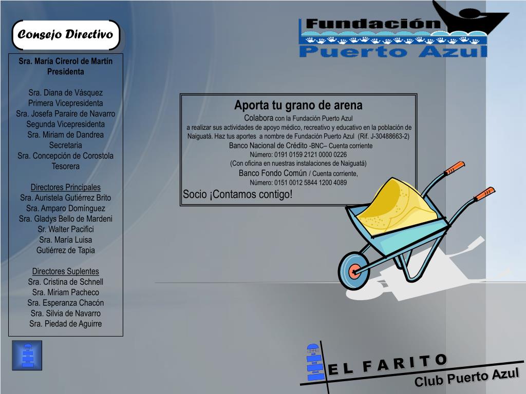 Consejo Directivo Sra. María Cirerol de Martín Presidenta Sra. Diana de Vásquez Primera VicepresidentaSra. Josefa Paraire de Navarro Segunda VicepresidentaSra. Miriam de Dandrea SecretariaSra. Concepción de Corostola Tesorera Directores PrincipalesSra. Auristela Gutiérrez BritoSra. Amparo DomínguezSra. Gladys Bello de MardeniSr. Walter PacificiSra. María Luisa Gutiérrez de Tapia Directores SuplentesSra. Cristina de SchnellSra. Miriam PachecoSra. Esperanza ChacónSra. Silvia de NavarroSra. Piedad de Aguirre Aporta tu grano de arena Colabora con la Fundación Puerto Azul a realizar sus actividades de apoyo médico, recreativo y educativo en la población de Naiguatá. Haz tus aportes a nombre de Fundación Puerto Azul (Rif. J-30488663-2) Banco Nacional de Crédito -BNC– Cuenta corriente Número: 0191 0159 2121 0000 0226 (Con oficina en nuestras instalaciones de Naiguatá) Banco Fondo Común / Cuenta corriente, Número: 0151 0012 5844 1200 4089 Socio ¡Contamos contigo!