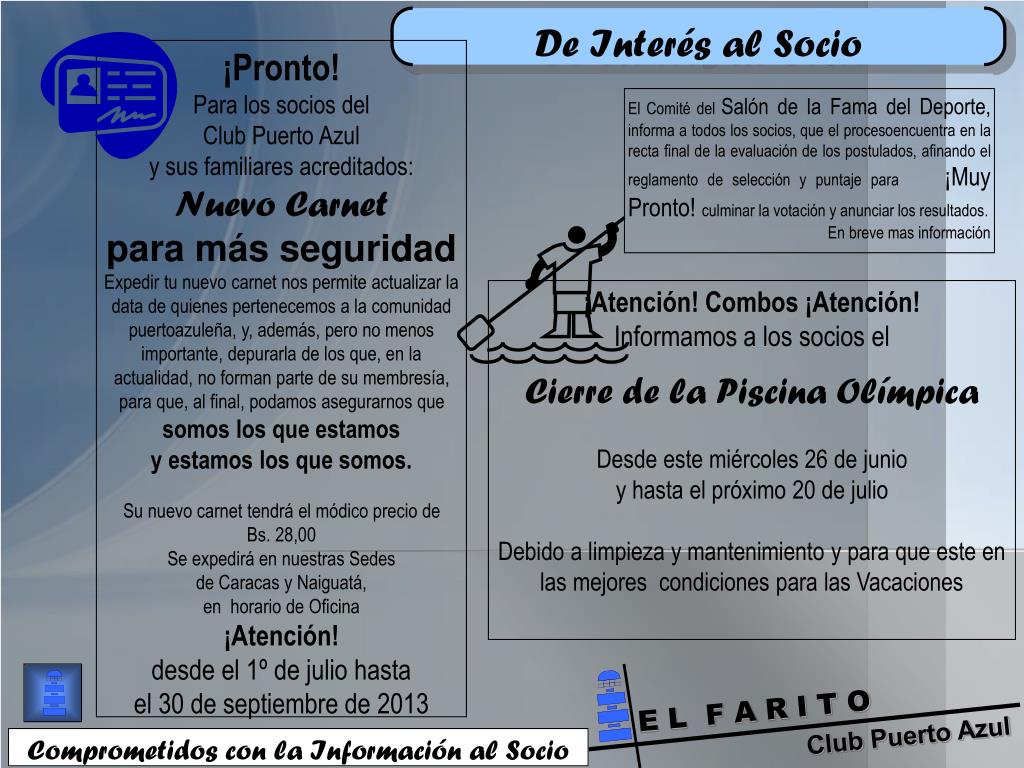De Interés al Socio ¡Pronto! Para los socios del Club Puerto Azul y sus familiares acreditados: Nuevo Carnet para más seguridad Expedir tu nuevo carnet nos permite actualizar la data de quienes pertenecemos a la comunidad puertoazuleña, y, además, pero no menos importante, depurarla de los que, en la actualidad, no forman parte de su membresía, para que, al final, podamos asegurarnos que somos los que estamos y estamos los que somos. Su nuevo carnet tendrá el módico precio de Bs. 28,00 Se expedirá en nuestras Sedes de Caracas y Naiguatá, en horario de Oficina ¡Atención! desde el 1º de julio hasta el 30 de septiembre de 2013 El Comité del Salón de la Fama del Deporte, informa a todos los socios, que el procesoencuentra en la recta final de la evaluación de los postulados, afinando el reglamento de selección y puntaje para ¡Muy Pronto! culminar la votación y anunciar los resultados. En breve mas información ¡Atención! Combos ¡Atención! Informamos a los socios el Cierre de la Piscina Olímpica Desde este miércoles 26 de junio y hasta el próximo 20 de julio Debido a limpieza y mantenimiento y para que este en las mejores condiciones para las Vacaciones Comprometidos con la Información al Socio