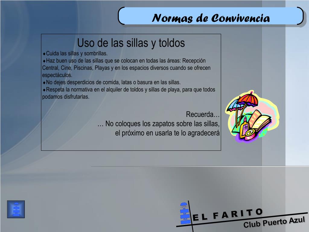 Normas de Convivencia Uso de las sillas y toldos • Cuida las sillas y sombrillas. • Haz buen uso de las sillas que se colocan en todas las áreas: Recepción Central, Cine, Piscinas, Playas y en los espacios diversos cuando se ofrecen espectáculos. • No dejes desperdicios de comida, latas o basura en las sillas. • Respeta la normativa en el alquiler de toldos y sillas de playa, para que todos podamos disfrutarlas. Recuerda… … No coloques los zapatos sobre las sillas, el próximo en usarla te lo agradecerá