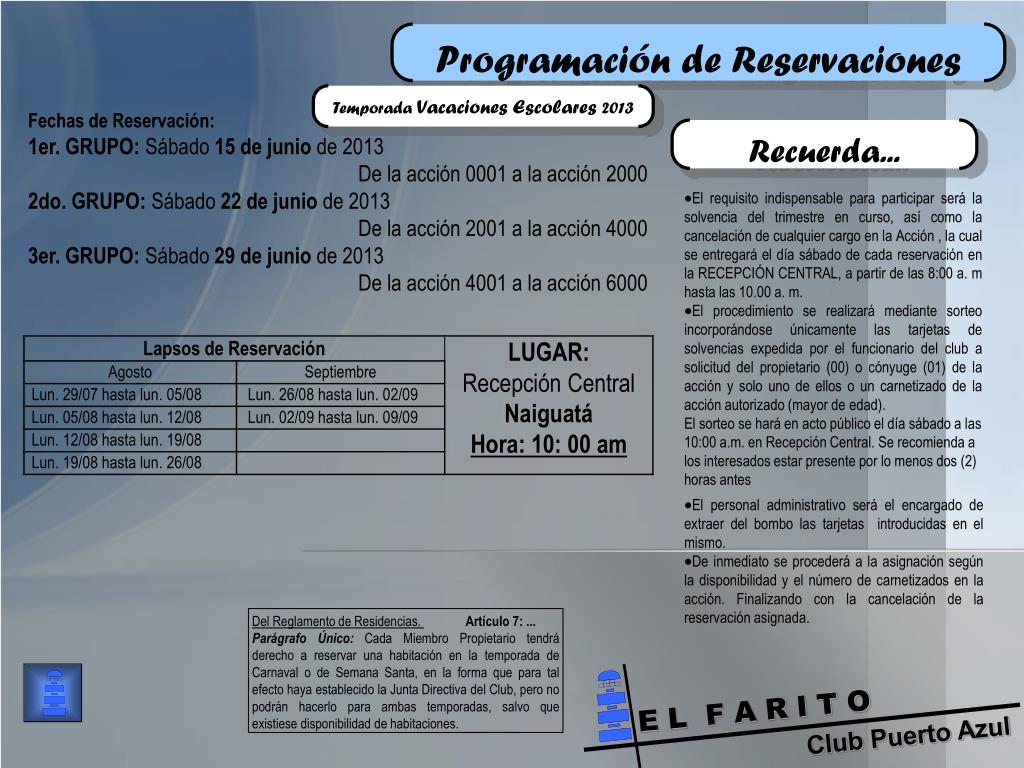 Programación de Reservaciones Temporada Vacaciones Escolares 2013 Fechas de Reservación: 1er. GRUPO: Sábado 15 de junio de 2013 De la acción 0001 a la acción 2000 2do. GRUPO: Sábado 22 de junio de 2013 De la acción 2001 a la acción 4000 3er. GRUPO: Sábado 29 de junio de 2013 De la acción 4001 a la acción 6000 Recuerda... • El requisito indispensable para participar será la solvencia del trimestre en curso, así como la cancelación de cualquier cargo en la Acción , la cual se entregará el día sábado de cada reservación en la RECEPCIÓN CENTRAL, a partir de las 8:00 a. m hasta las 10.00 a. m. • El procedimiento se realizará mediante sorteo incorporándose únicamente las tarjetas de solvencias expedida por el funcionario del club a solicitud del propietario (00) o cónyuge (01) de la acción y solo uno de ellos o un carnetizado de la acción autorizado (mayor de edad). • El sorteo se hará en acto público el día sábado a las 10:00 a.m. en Recepción Central. Se recomienda a los interesados estar presente por lo menos dos (2) horas antes • El personal administrativo será el encargado de extraer del bombo las tarjetas introducidas en el mismo. • De inmediato se procederá a la asignación según la disponibilidad y el número de carnetizados en la acción. Finalizando con la cancelación de la reservación asignada. Del Reglamento de Residencias. Artículo 7: ... Parágrafo Único: Cada Miembro Propietario tendrá derecho a reservar una habitación en la temporada de Carnaval o de Semana Santa, en la forma que para tal efecto haya establecido la Junta Directiva del Club, pero no podrán hacerlo para ambas temporadas, salvo que existiese disponibilidad de habitaciones.
