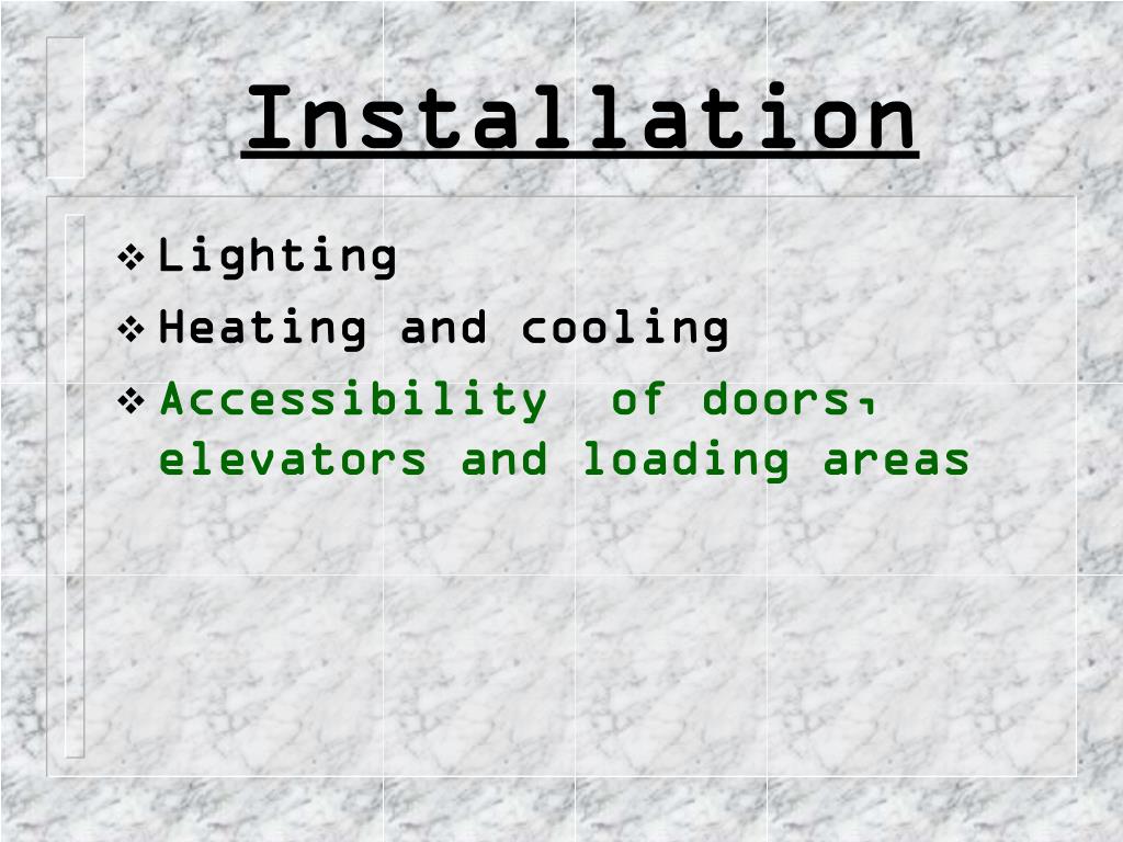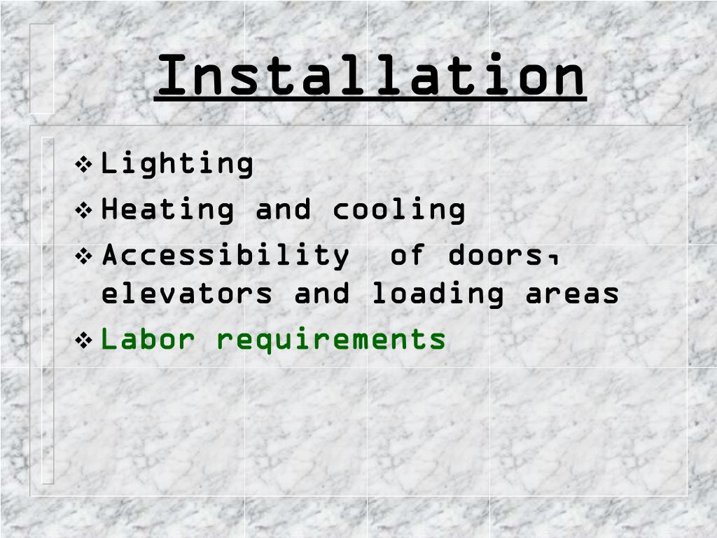 Installation • Lighting • Heating and cooling • Accessibility of doors, elevators and loading areas • Labor requirements