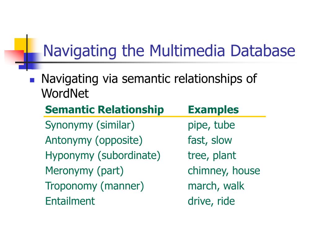 Navigating the Multimedia Database • Navigating via semantic relationships of WordNet Semantic Relationship Examples Synonymy (similar) pipe, tube Antonymy (opposite) fast, slow Hyponymy (subordinate) tree, plant Meronymy (part) chimney, house Troponomy (manner) march, walk Entailment drive, ride