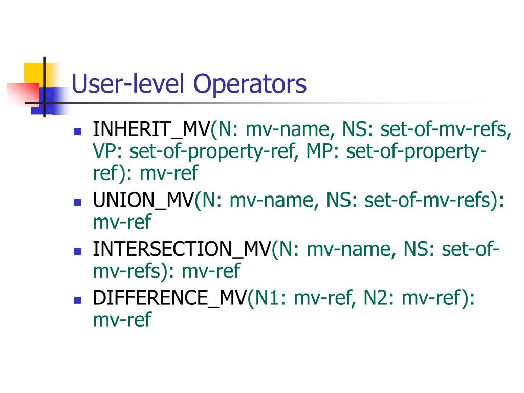 User-level Operators • INHERIT_MV(N: mv-name, NS: set-of-mv-refs, VP: set-of-property-ref, MP: set-of-property-ref): mv-ref • UNION_MV(N: mv-name, NS: set-of-mv-refs): mv-ref • INTERSECTION_MV(N: mv-name, NS: set-of-mv-refs): mv-ref • DIFFERENCE_MV(N1: mv-ref, N2: mv-ref): mv-ref