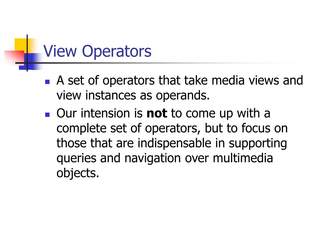View Operators • A set of operators that take media views and view instances as operands. • Our intension is not to come up with a complete set of operators, but to focus on those that are indispensable in supporting queries and navigation over multimedia objects.