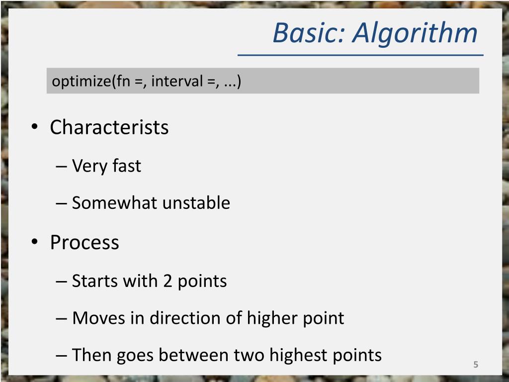 Basic: Algorithm • Characterists • Very fast • Somewhat unstable • Process • Starts with 2 points • Moves in direction of higher point • Then goes between two highest points optimize(fn =, interval =, ...)