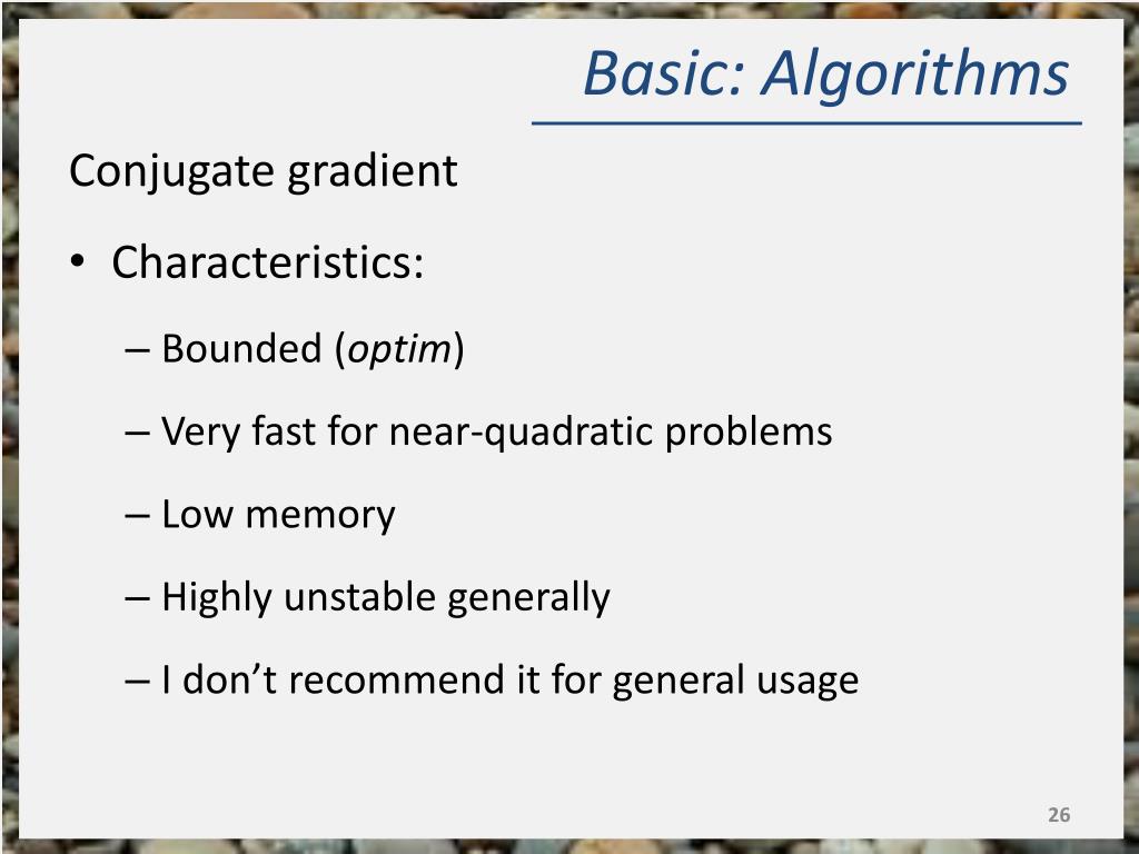 Basic: Algorithms Conjugate gradient • Characteristics: • Bounded (optim) • Very fast for near-quadratic problems • Low memory • Highly unstable generally • I don’t recommend it for general usage