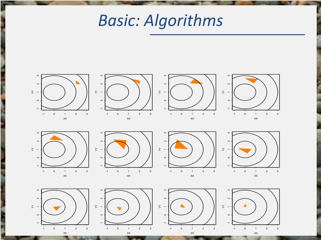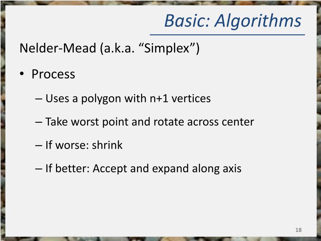 Basic: Algorithms Nelder-Mead (a.k.a. “Simplex”) • Process • Uses a polygon with n+1 vertices • Take worst point and rotate across center • If worse: shrink • If better: Accept and expand along axis