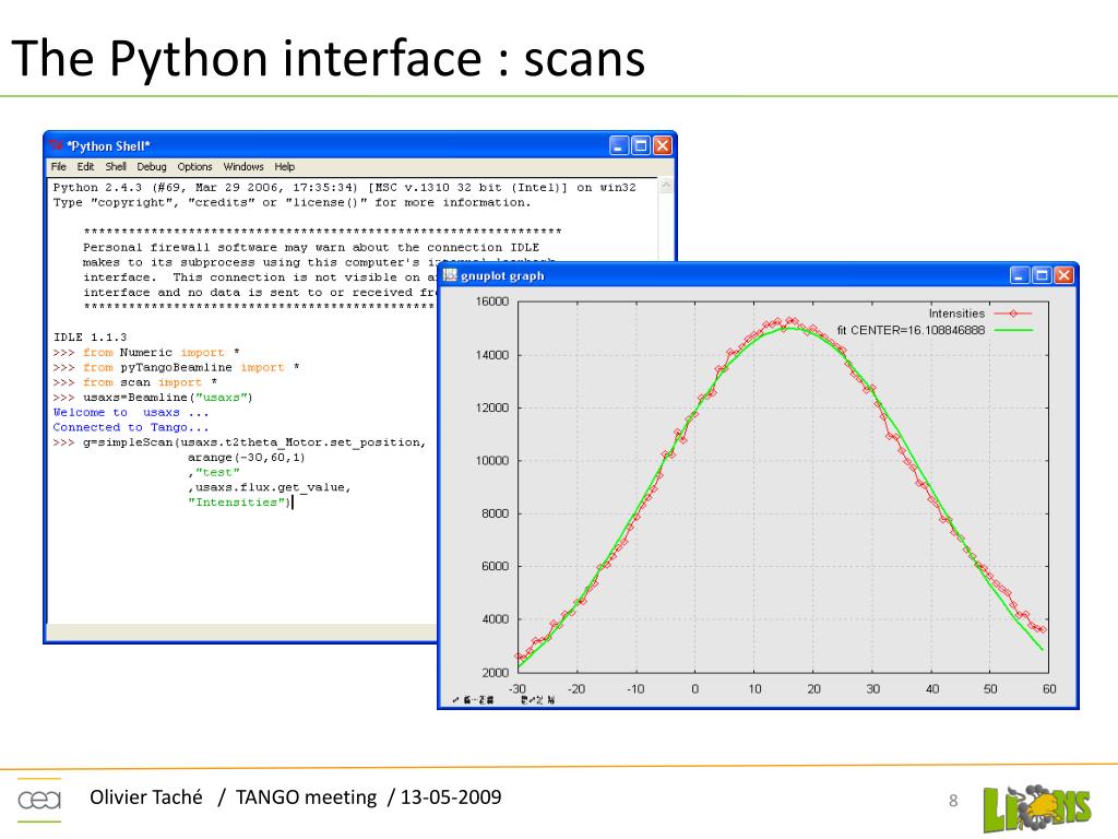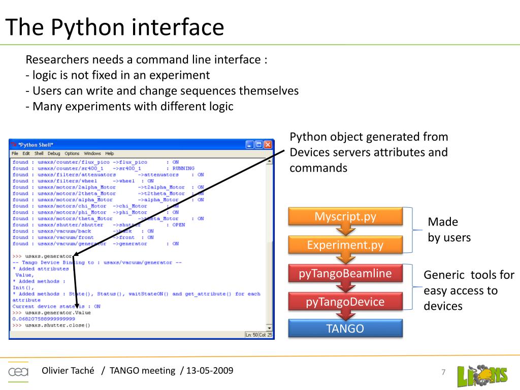 The Python interface • Researchers needs a command line interface : • logic is not fixed in an experiment • Users can write and change sequences themselves • Many experiments with different logic Python object generated from Devices servers attributes and commands Myscript.py Made by users Experiment.py pyTangoBeamline Generic tools for easy access to devices pyTangoDevice TANGO