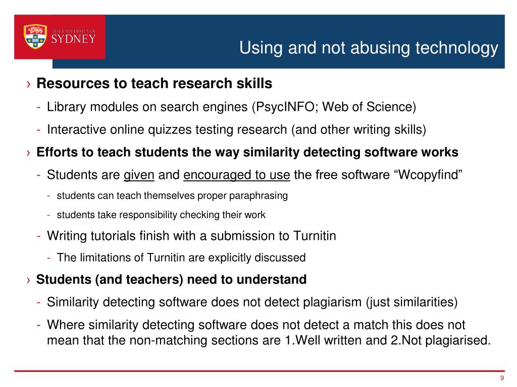 Using and not abusing technology • Resources to teach research skills • Library modules on search engines (PsycINFO; Web of Science) • Interactive online quizzes testing research (and other writing skills) • Efforts to teach students the way similarity detecting software works • Students are given and encouraged to use the free software “Wcopyfind” • students can teach themselves proper paraphrasing • students take responsibility checking their work • Writing tutorials finish with a submission to Turnitin • The limitations of Turnitin are explicitly discussed • Students (and teachers) need to understand • Similarity detecting software does not detect plagiarism (just similarities) • Where similarity detecting software does not detect a match this does not mean that the non-matching sections are 1.Well written and 2.Not plagiarised.