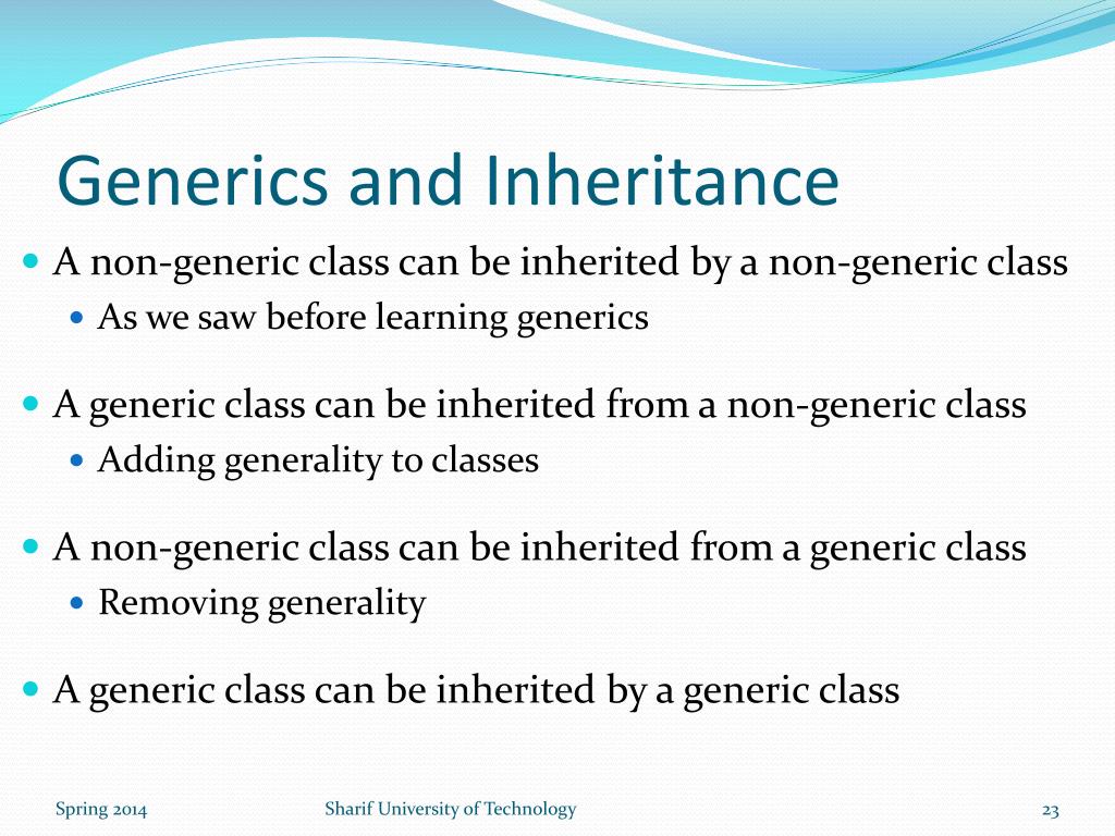 Generics and Inheritance • A non-generic class can be inherited by a non-generic class • As we saw before learning generics • A generic class can be inherited from a non-generic class • Adding generality to classes • A non-generic class can be inherited from a generic class • Removing generality • A generic class can be inherited by a generic class Sharif University of Technology