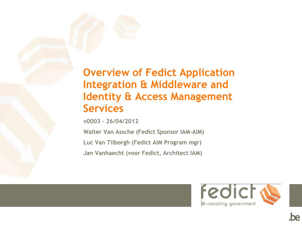 Overview of Fedict Application Integration & Middleware and Identity & Access Management Services v0003 – 26/04/2012 Walter Van Assche (Fedict Sponsor IAM-AIM) Luc Van Tilborgh (Fedict AIM Program mgr) Jan Vanhaecht (voor Fedict, Architect IAM)