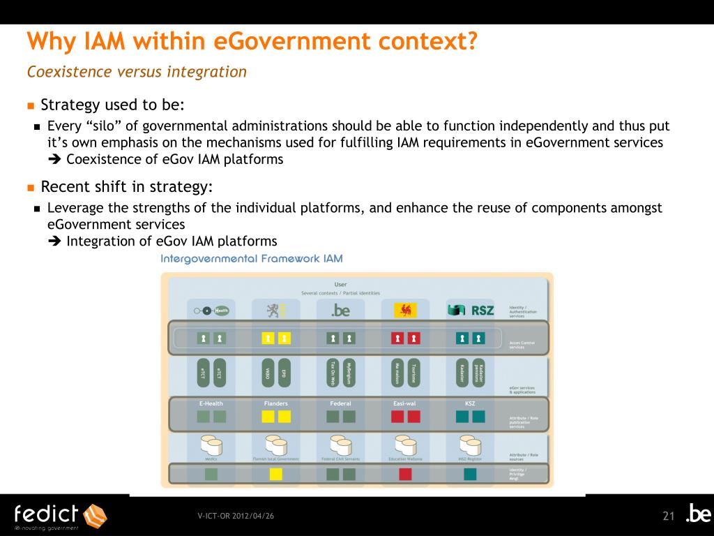Why IAM within eGovernment context? Coexistence versus integration • Strategy used to be: • Every “silo” of governmental administrations should be able to function independently and thus put it’s own emphasis on the mechanisms used for fulfilling IAM requirements in eGovernment services Coexistence of eGov IAM platforms • Recent shift in strategy: • Leverage the strengths of the individual platforms, and enhance the reuse of components amongst eGovernment services Integration of eGov IAM platforms V-ICT-OR 2012/04/26