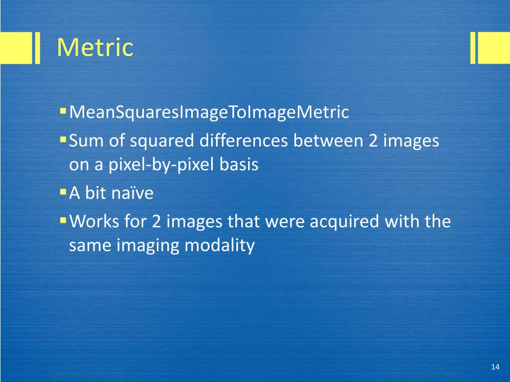 Metric • MeanSquaresImageToImageMetric • Sum of squared differences between 2 images on a pixel-by-pixel basis • A bit naïve • Works for 2 images that were acquired with the same imaging modality