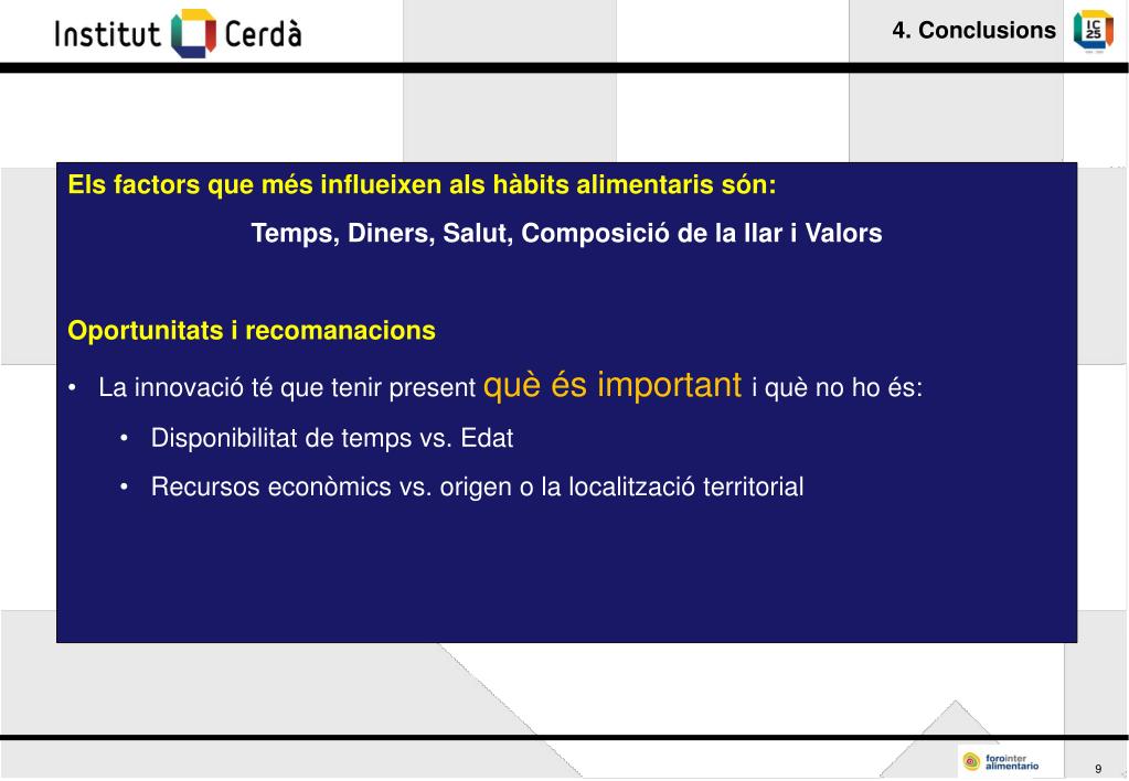 4. Conclusions Els factors que més influeixen als hàbits alimentaris són: Temps, Diners, Salut, Composició de la llar i Valors Oportunitats i recomanacions • La innovació té que tenir present què és important i què no ho és: • Disponibilitat de temps vs. Edat • Recursos econòmics vs. origen o la localització territorial