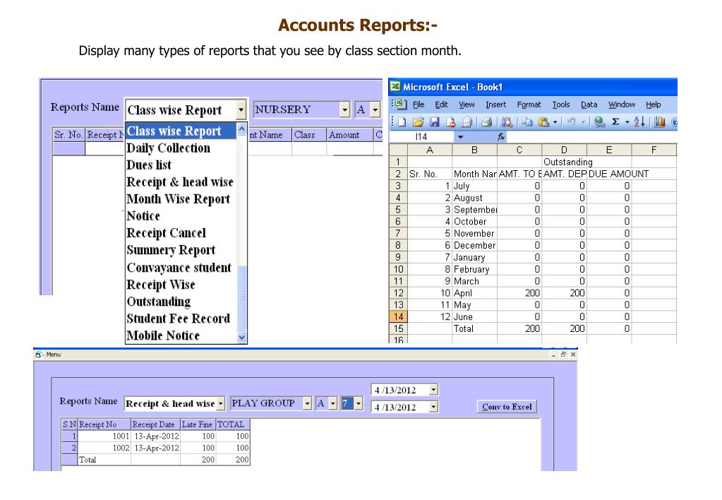 Accounts Reports:- Display many types of reports that you see by class section month.