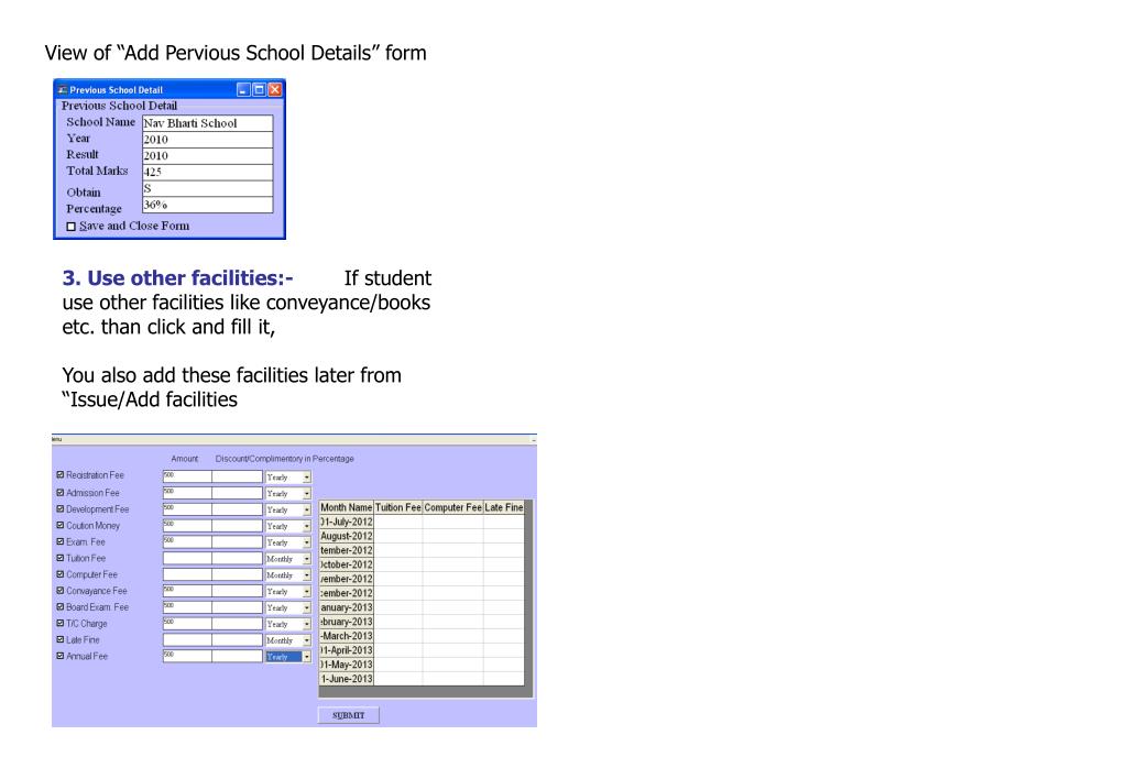 View of “Add Pervious School Details” form 3. Use other facilities:- If student use other facilities like conveyance/books etc. than click and fill it, You also add these facilities later from “Issue/Add facilities