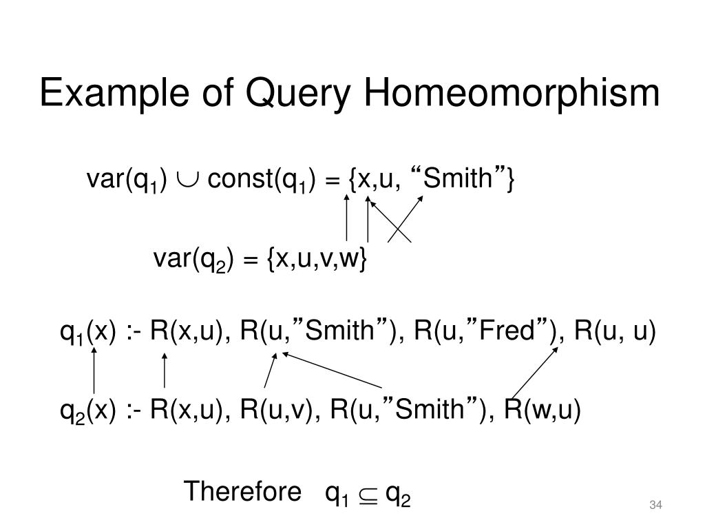 Example of Query Homeomorphism var(q1) const(q1) = {x,u, “Smith”} var(q2) = {x,u,v,w} q1(x) :- R(x,u), R(u,”Smith”), R(u,”Fred”), R(u, u) q2(x) :- R(x,u), R(u,v), R(u,”Smith”), R(w,u) Therefore q1 q2