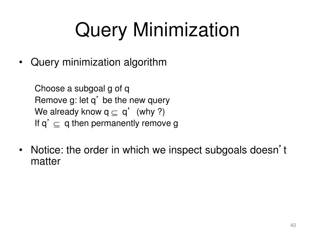 Query Minimization Definition A conjunctive query q is minimal if for every other conjunctive query q’ s.t. q q’, q’ has at least as many predicates (‘subgoals’) as q Are these queries minimal ? q(x) :- R(x,y), R(y,z), R(x,x) q(x) :- R(x,y), R(y,z), R(x,’Alice’)