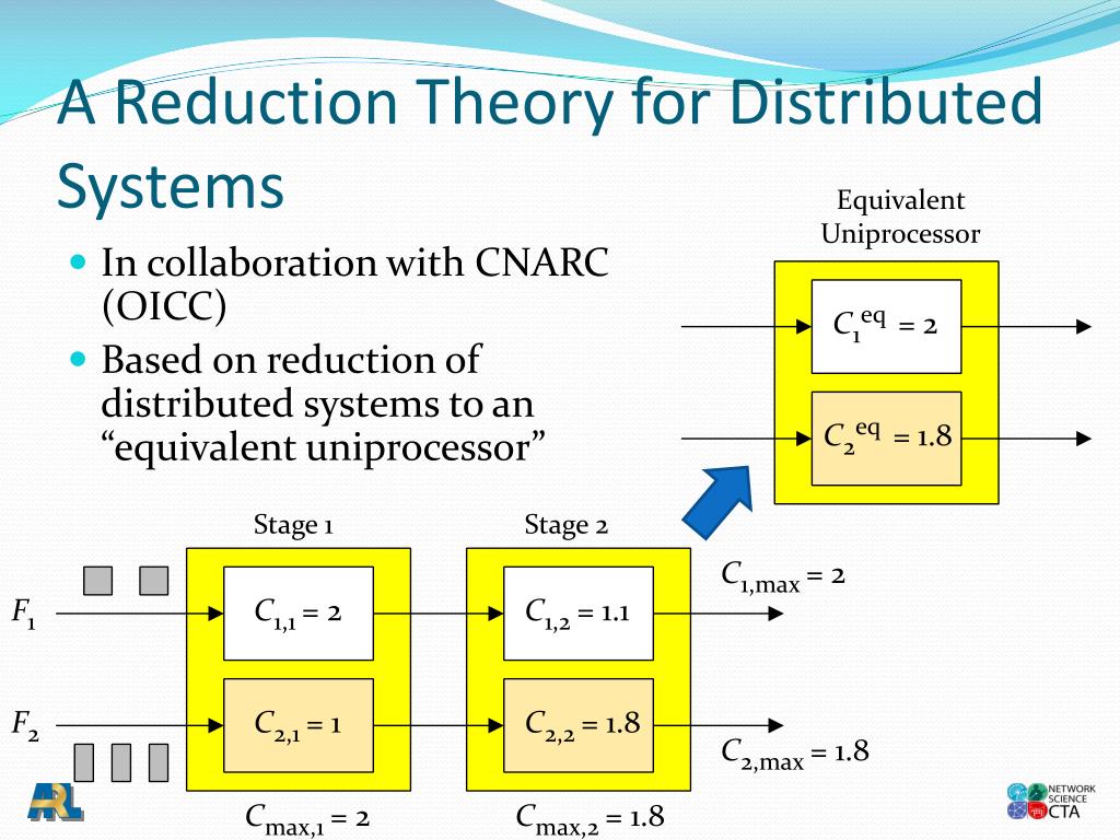 A Reduction Theory for Distributed Systems Equivalent Uniprocessor • In collaboration with CNARC (OICC) • Based on reduction of distributed systems to an “equivalent uniprocessor” C1eq= 2 C2eq = 1.8 Stage 1 Stage 2 C1,max = 2 F1 C1,1 = 2 C1,2 = 1.1 F2 C2,1 = 1 C2,2 = 1.8 C2,max = 1.8 Cmax,1 = 2 Cmax,2 = 1.8