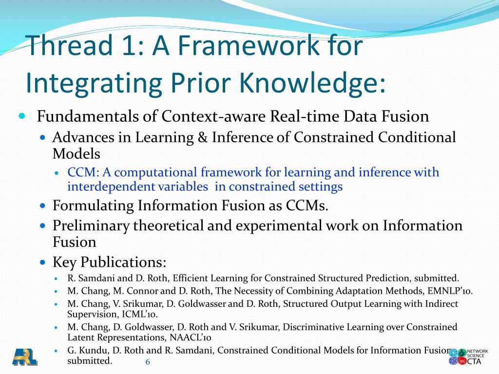 Thread 1: A Framework for Integrating Prior Knowledge: • Fundamentals of Context-aware Real-time Data Fusion • Advances in Learning & Inference of Constrained Conditional Models • CCM: A computational framework for learning and inference with interdependent variables in constrained settings • Formulating Information Fusion as CCMs. • Preliminary theoretical and experimental work on Information Fusion • Key Publications: • R. Samdani and D. Roth, Efficient Learning for Constrained Structured Prediction, submitted. • M. Chang, M. Connor and D. Roth, The Necessity of Combining Adaptation Methods, EMNLP’10. • M. Chang, V. Srikumar, D. Goldwasser and D. Roth, Structured Output Learning with Indirect Supervision, ICML’10. • M. Chang, D. Goldwasser, D. Roth and V. Srikumar, Discriminative Learning over Constrained Latent Representations, NAACL’10 • G. Kundu, D. Roth and R. Samdani, Constrained Conditional Models for Information Fusion, submitted.