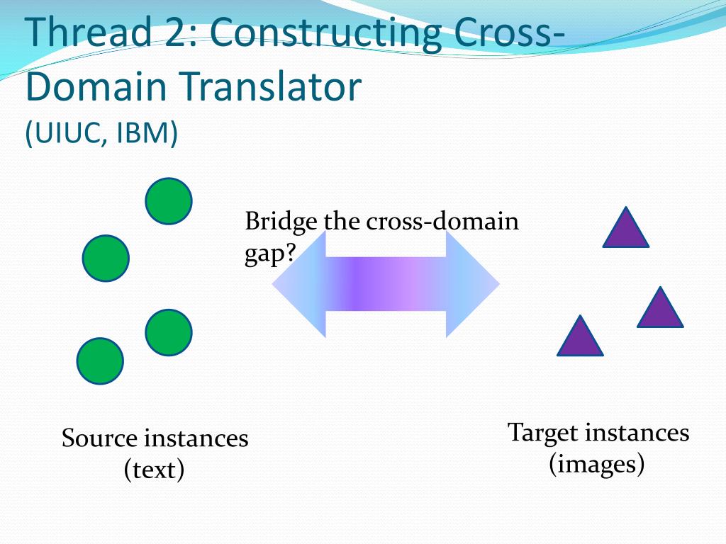 Thread 2: Constructing Cross-Domain Translator(UIUC, IBM) Bridge the cross-domain gap? Target instances (images) Source instances (text)