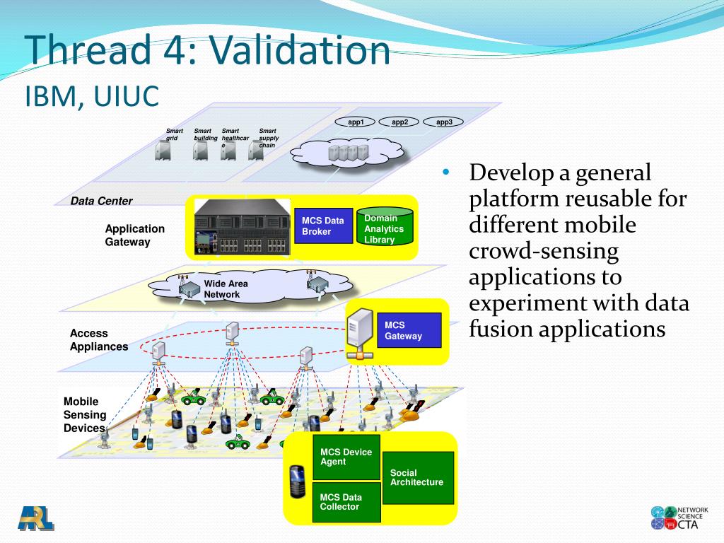 app1 app2 app3 Smart grid Smart building Smart healthcare Smart supply chain Data Center Domain Analytics Library MCS Data Broker Application Gateway Wide Area Network MCS Gateway Access Appliances Mobile Sensing Devices MCS Device Agent Social Architecture MCS Data Collector Thread 4: ValidationIBM, UIUC • Develop a general platform reusable for different mobile crowd-sensing applications to experiment with data fusion applications