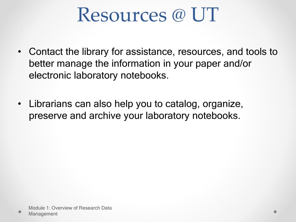 Resources @ UT • Contact the library for assistance, resources, and tools to better manage the information in your paper and/or electronic laboratory notebooks. • Librarians can also help you to catalog, organize, preserve and archive your laboratory notebooks. Module 1: Overview of Research Data Management
