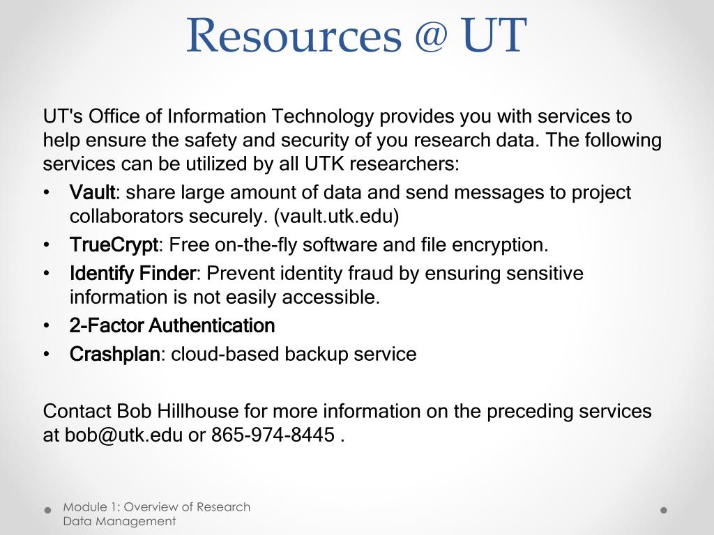 Resources @ UT UT's Office of Information Technology provides you with services to help ensure the safety and security of you research data. The following services can be utilized by all UTK researchers: • Vault: share large amount of data and send messages to project collaborators securely. (vault.utk.edu) • TrueCrypt: Free on-the-fly software and file encryption. • Identify Finder: Prevent identity fraud by ensuring sensitive information is not easily accessible. • 2-Factor Authentication • Crashplan: cloud-based backup service Contact Bob Hillhouse for more information on the preceding services at bob@utk.edu or 865-974-8445 . Module 1: Overview of Research Data Management