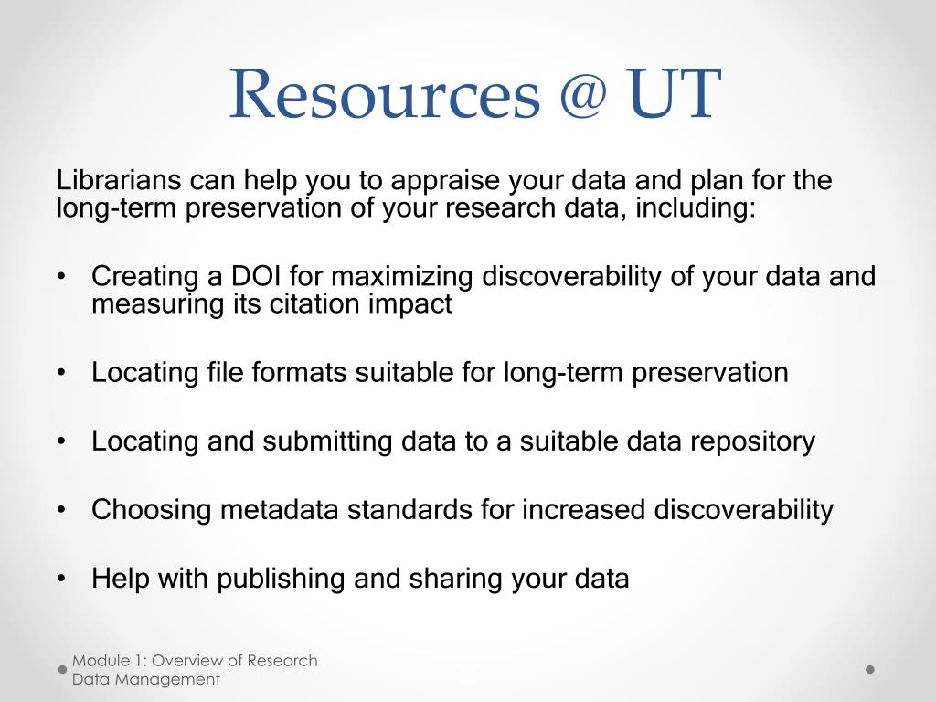 Resources @ UT Librarians can help you to appraise your data and plan for the long-term preservation of your research data, including: • Creating a DOI for maximizing discoverability of your data and measuring its citation impact • Locating file formats suitable for long-term preservation • Locating and submitting data to a suitable data repository • Choosing metadata standards for increased discoverability • Help with publishing and sharing your data Module 1: Overview of Research Data Management
